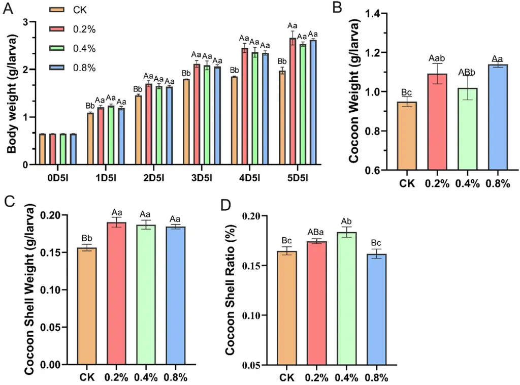 The results were striking. Silkworms fed a diet supplemented with B. subtilis showed a significant increase in body weight, with improvements ranging from 9.1% to 22.1% during the larval stages. Moreover, the feed utilization efficiency (FUE) improved by 4.09% to 6.80%, indicating that the silkworms were not only growing faster but also converting their food more efficiently. Cocoon quality metrics also saw notable enhancements, with a 9.77% increase in cocoon shell weight in females and a 6.56% improvement in the cocoon shell ratio.