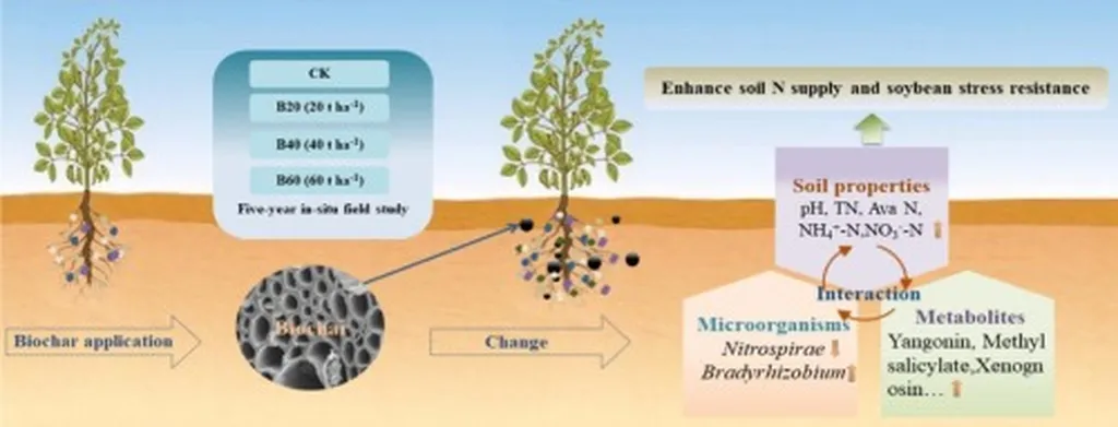 In the heart of Jilin Province, China, a groundbreaking study is reshaping our understanding of sustainable agriculture. Researchers have discovered that combining biochar, a carbon-rich product derived from organic waste, with Bradyrhizobium japonicum, a nitrogen-fixing bacterium, can significantly enhance soil health and boost soybean yields. This innovative approach, detailed in a recent study published in *Frontiers in Plant Science*, offers a promising solution to the pressing challenges of declining soil fertility and reduced microbial diversity in intensive farming systems.