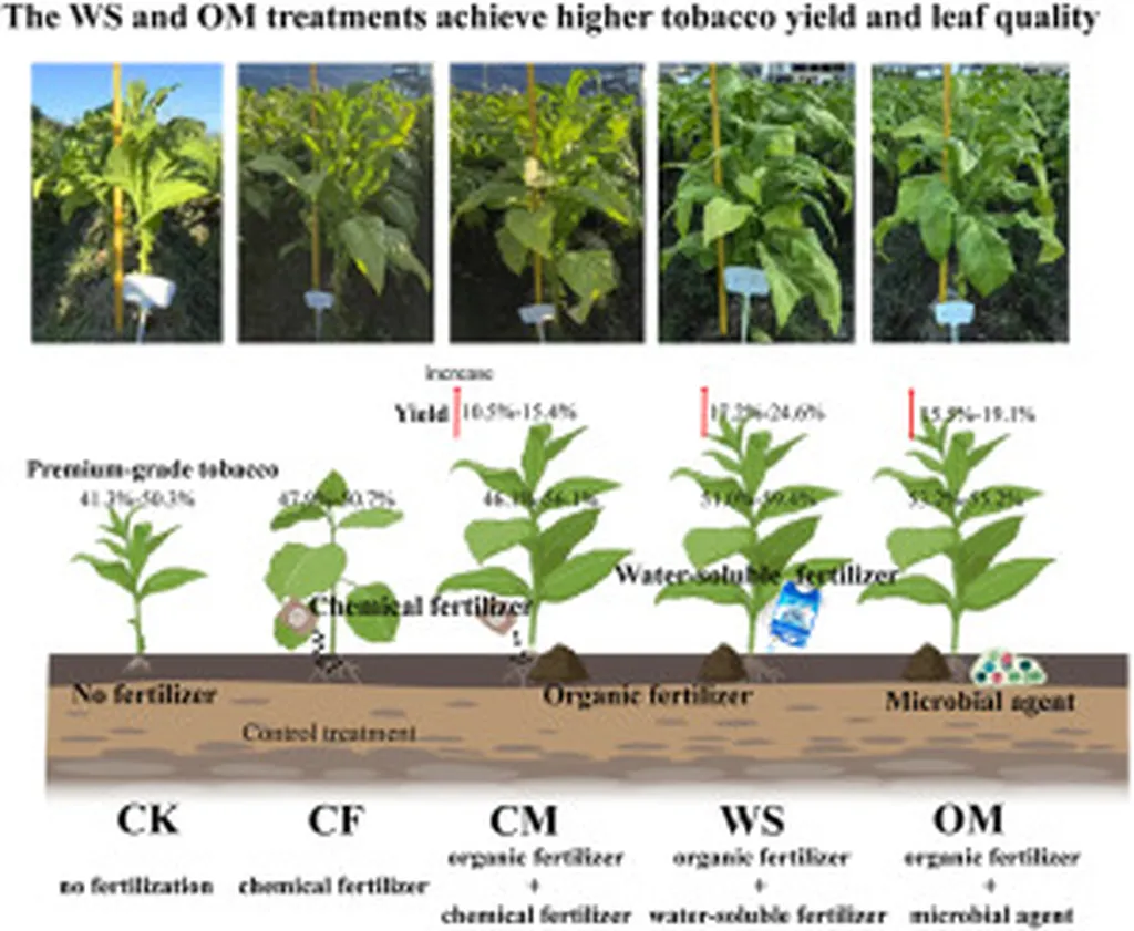 The study, conducted over two years, evaluated five distinct nutrient management strategies: no fertilization (CK), conventional chemical fertilizer (CF), organic fertilizer combined with conventional chemical fertilizer (CM), organic fertilizer combined with water-soluble fertilizer (WS), and organic fertilizer combined with a compound microbial agent (OM). The results were striking, particularly for the WS and OM treatments, which demonstrated significant improvements in tobacco yield and quality.